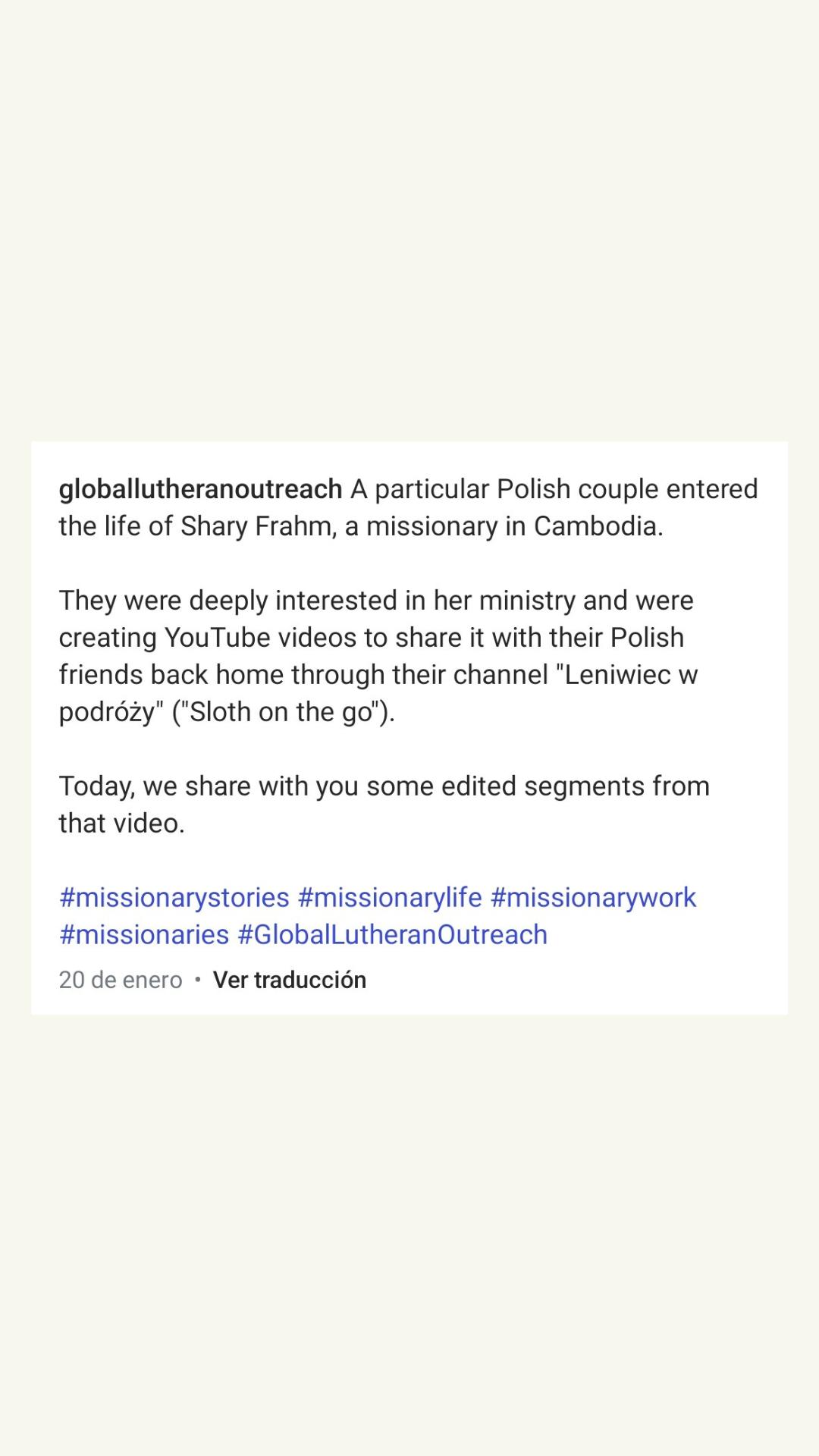 Este reel es una adaptación del video original publicado en YouTube por otros autores (una pareja de viajeros que se interesó en el trabajo de la misionera). Mejoré el hilo conductor de la historia y le di un final mucho más emotivo. Este reel también implicó un reto: la traducción del polaco original al inglés, de modo que pudiera entenderlo la audiencia principal de la cuenta del cliente. Ver el reel publicado.